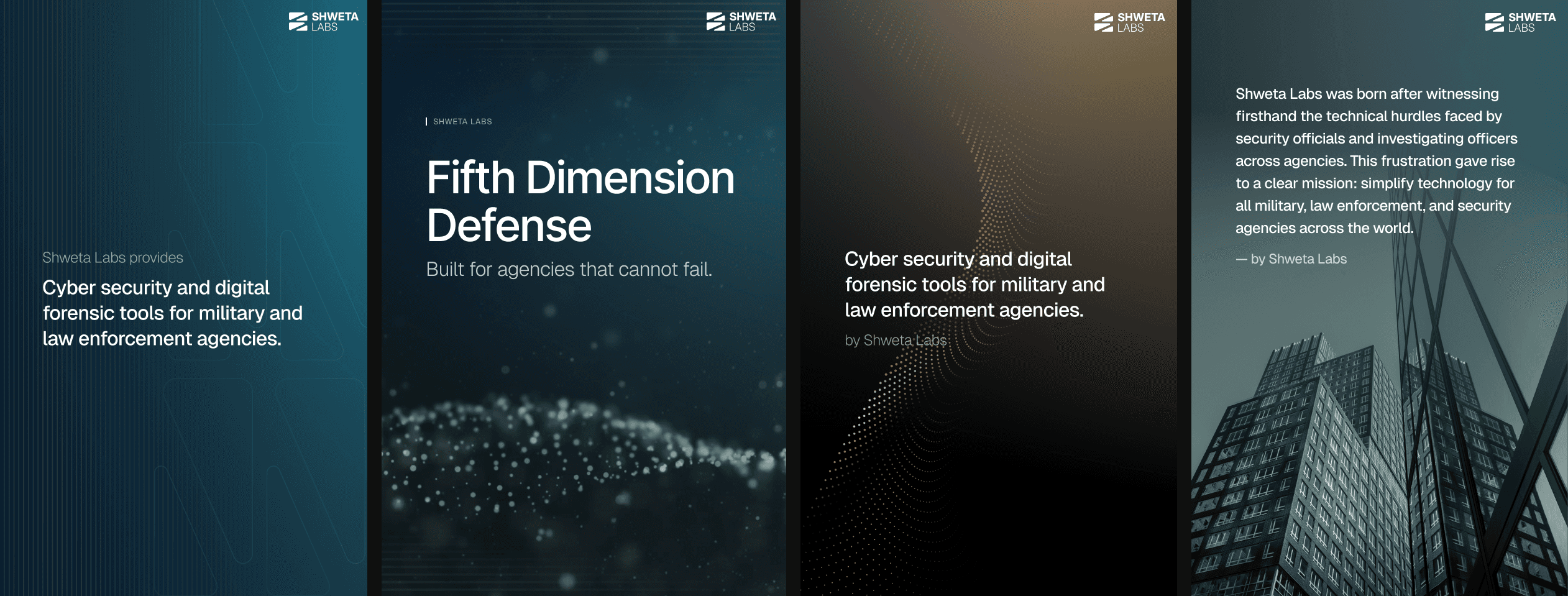For Shweta Labs, I worked on a focused brand identity refresh and helped build the product strategy & communication foundation for a company operating in the highly specialised space of forensic investigation and criminal intelligence tools.